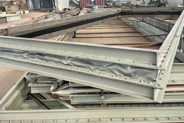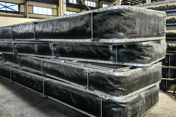 本文中所展示的圖片是我們翔盛環??萍脊窘谡跒樯綎|客戶生產制作的一批矩形非金屬補償器(矩形非金屬膨脹節)。非金屬補償器通常由纖維織物蒙皮(硅膠為紅色、氟膠為黑色)與管道接口形狀相同的金屬框架、以及其它的結構件所組成。